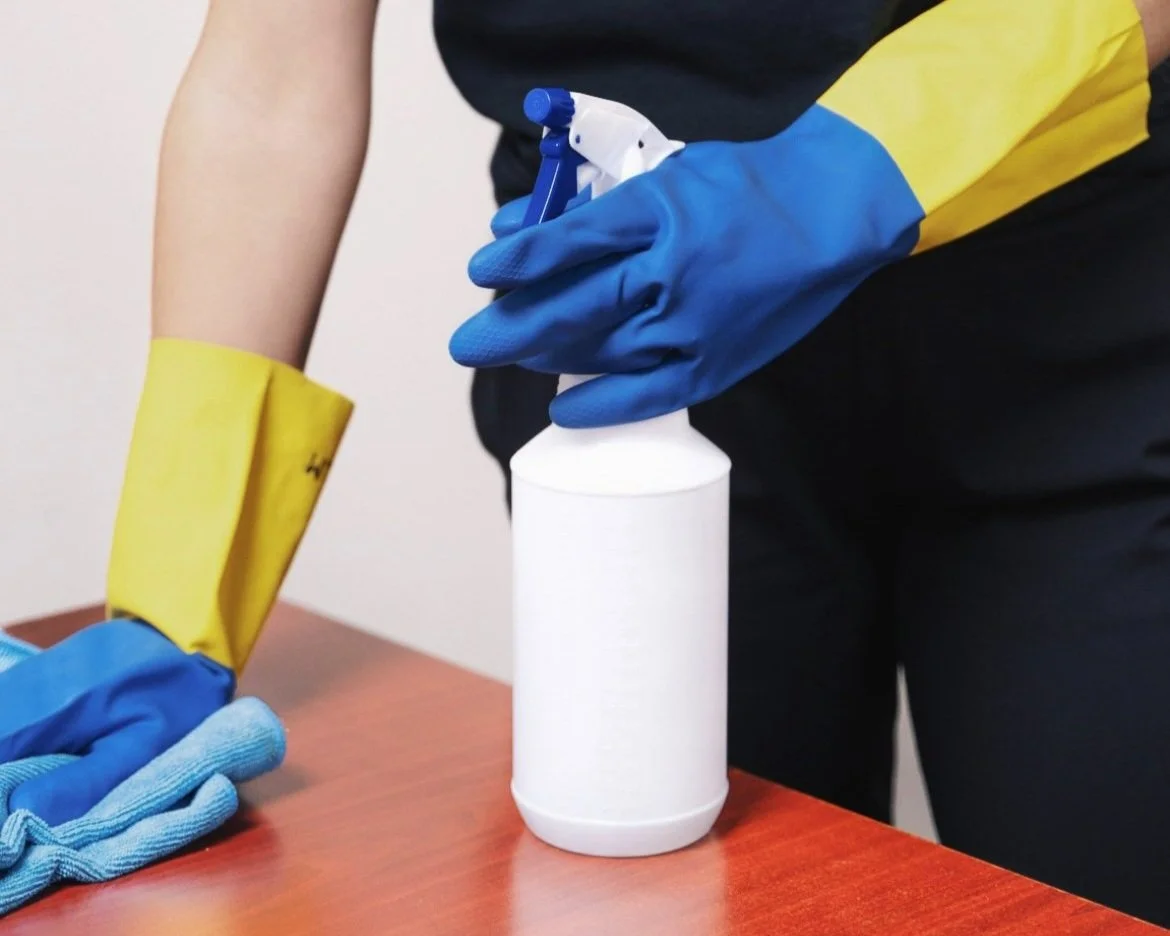 woman sanitizing a desk